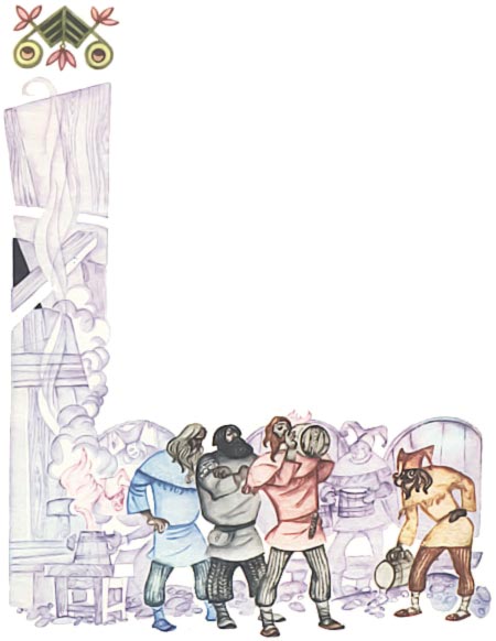 Принесли тот волшебный напиток огненный, налили первую чашу. Удильщик взял и выпил ее до дна – не поморщился. Налили другую чашу – выпил, и третью выпил. Скалолом шесть чаш выпил, а Ольховая Чурка – все девять до дна осушил. Разнеслась весть по округе: нашлись богатыри, которые могут зарю, месяц и солнце освободить!