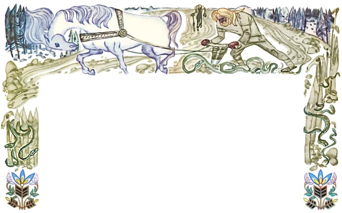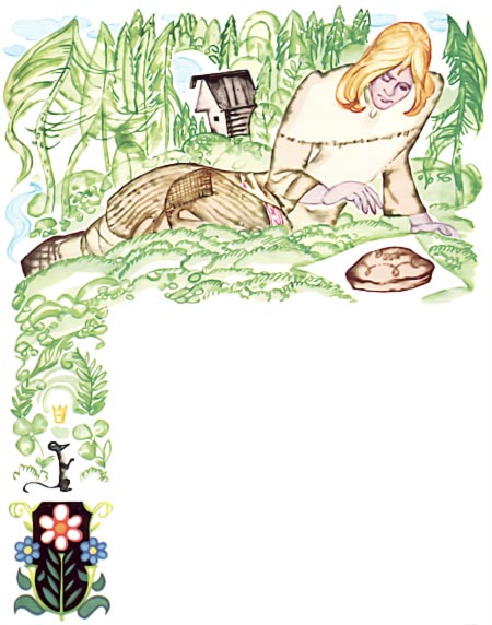 – Найти-то можно, но повидаться с ним трудно, – говорит старуха. – Сюоятар его зорко стережет. Каждое утро она посылает его через непроходимые леса дальнее поле пахать. А поле это заколдованное – вся изгородь вокруг него обвита змеями. А на ночь Сюоятар запирает его в амбар и перед сном поит сонным зельем, чтобы он ночью не убежал. Но я тебе помогу. У Сюоятар есть три амбара, полных льна. Ты попросись к ней прясть, она тебя возьмет, но даст одну неделю сроку. Если ты за это время не спрядешь весь лен, Сюоятар превратит тебя в чайку. Но я дам тебе вот эту дудку. Как только дунешь в нее, появится мышей видимо-невидимо. Хлопни три раза в ладоши – и они превратятся в девушек и спрядут тебе лен. А еще дам я тебе вот это перышко ласточки, оно тоже может пригодиться. Дунь на него и обернешься ласточкой.