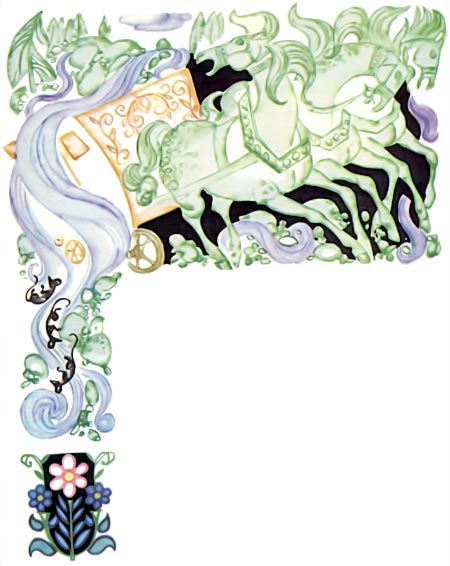 Парень остановился в смущении, не знает, как и быть, что же он теперь отцу скажет? Сосватал себе мышь, и та утонула. Но не успел он еще с места тронуться, как вдруг вода в реке забурлила и на берег выскочила тройка вороных коней, запряженных в золоченую карету! Выбрались кони на дорогу, кучер осадил их, тройка остановилась. А из кареты выходит девушка невиданной красоты, и во сне ему такая никогда не снилась! Стоит он, будто к месту прирос. А девушка смотрит на него, улыбается и говорит:
