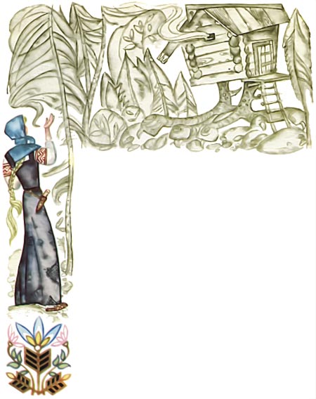 Поблагодарила женщина старуху и пошла к Сюоятар. Три года шла, пути не разбирая. Ночи не спала. И дошла наконец до лесной поляны, где был дом Сюоятар. Заходит в избу, здоровается.