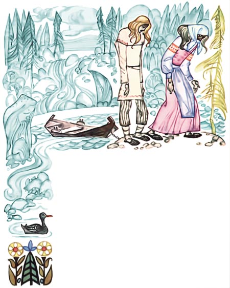 Сестра заплакала, но ослушаться не посмела, плюнула в воду, выпрыгнула из лодки, обернулась черной уточкой и поплыла. А Сюоятар рада, надела ее подвенечный наряд.