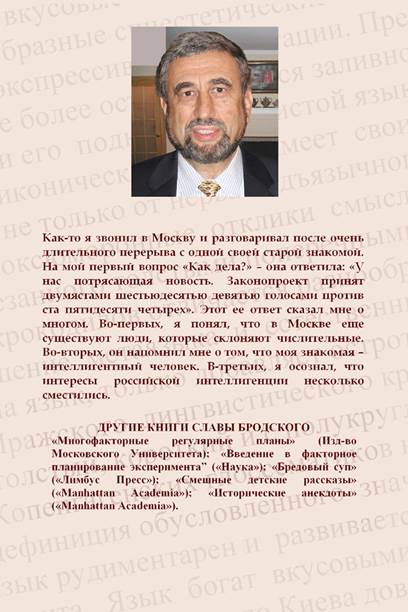 С 1991 года Слава Бродский живет в Америке. В 2004 году он начал свою писательскую карьеру. Тогда была опубликована его первая повесть «Бредовый суп». В 2007 году почти одновременно выходят его три новые книги. «Релятивистская концепция языка» – одна из них.