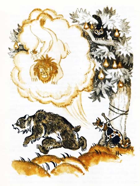 – Послушай, ворожея, клянусь, что и когтем тебя не трону! Нам грозит одинаковая опасность: обжора-медведь сейчас будет здесь. Необходимо объединить наши силы и поразмыслить, как от этой опасности избавиться и сохранить в целости наши хвосты и головы.