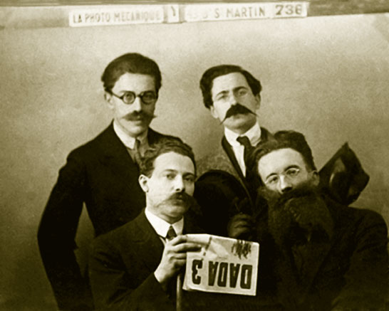 Слева направо: Андре Бретон, Рене Ильсом, Луи Арагон, Поль Элюар с наклеенными усами и в париках. 1919 г.