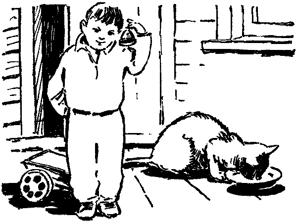 В контору, тоже как-то случайно, забрела и прижилась серая полосатая кошка Михрютка. С Витюком у неё сразу наладилась большая дружба. Утром, как Дарья подоит козу, первое блюдечко парного молока он тащил Михрютке, а та позволяла ему сколько угодно любоваться на пятёрку таких же, как она, полосатых котят.