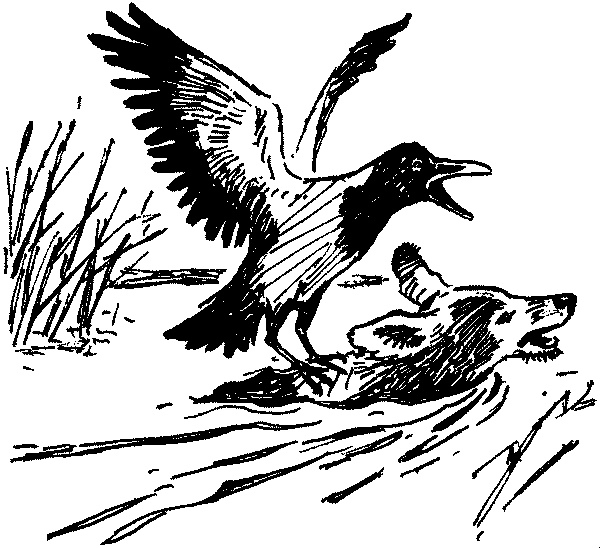 И воронёнок поселился в сарае. Приручать его не пришлось. Осмотревшись на новом месте, он подскакал к нам и, раскрыв рот, с криком стал махать крыльями.