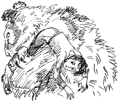 Медведь перекинул его повыше на плечо. Теперь Алёшка мог крикнуть, позвать на помощь, но дома уже не было видно.