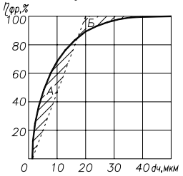 На рис. 15 показана кривая фракционной эффективности циклонов. Зона А содержит частицы, которые должны были бы пройти через циклон, но улавливаются вследствие коагуляции или