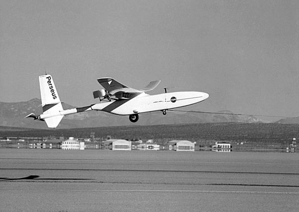 Поскольку диаметр двигателя больше, чем ноги шасси, то машина запускается как планер с пропеллером, закрепленным в горизонтальном положении. После того как будет набрана некоторая высота, буксировочный трос сбрасывается, включается двигатель, и «Персей» уходит ввысь. В полете машина управляется компьютером, как по командам с Земли, так и в автоматическом режиме, поскольку бортовой навигационный комплекс способен воспринимать и обрабатывать информацию от глобальной спутниковой системы определения местоположения.