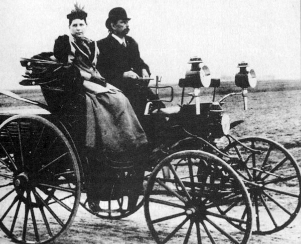Немалую рекламу изобретению своего мужа сделала фрау Берта Бенц. В 1888 году тайком от мужа отважная женщина совершила вместе с двумя сыновьями первый автомобильный пробег длиной аж в 180 км! По пути находчивой автомобилистке пришлось заново обшивать кожей тормоз у деревенского сапожника, укорачивать с помощью кузнеца вытянувшуюся приводную цепь, изолировать электрический провод резиновой чулочной подвязкой и прочищать трубку подачи топлива шляпной булавкой. А бензин путешественники покупали в бакалейных лавках и в аптеках – его тогда использовали как средство для чистки одежды и перчаток, а также как лекарство от некоторых кожных болезней.