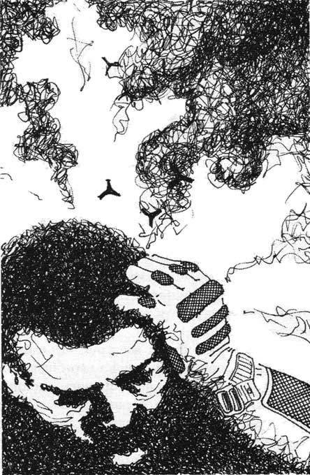 Ця картина, яку він ніколи не забуде, – люди під чорною лавиною – раптом дивовижно змінилася. Атаковані перестали звиватися на камінні, втікати, заповзати в дротяні хащі. Вони помалу вставали чи сідали, а хмара, розділившись на низку воронок, сформувала над кожним ніби локальний вир. Одним дотиком оточувала тіло чи голову нещасного, після чого віддалялася, збурена, гудячи все вище між стінами яру, аж заступила світло надвечірнього неба. Потім, у протяжному стихаючому шумі, вповзла у скелі, впала у чорні хащі та зникла – лише дрібні чорні крапочки, що зрідка лежали між нерухомими постатями, нагадували про реальність того, що трапилося мить тому.