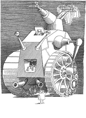 Сказавши це, він подався до відведених йому апартаментів і оглянув кульку. Побачив, що вона аж побуряковіла, і зрозумів – Трурль чинив подібне у короля Потворика. Невдовзі сам король доручив Кляпавцієві переробити одну роту піхоти. І ось цей маленький загін, умить перейнявшись єдиним духом, закричав: «Бий‑убий!» – і, кинувшись із пагорка на три озброєні до зубів королівські кірасирські ескадрони, що ними командувало аж шестеро викладачів Академії Генерального штабу, ущент розбив їх. Дуже засмутилися всі маршали, штабні й стройовики, генерали й адмірали, яких король одразу ж вигнав на пенсію. А сам монарх, пересвідчившись, що Кляпавцієва реформа – це й справді переворот у військовій справі, доручив йому реорганізувати всю армію.