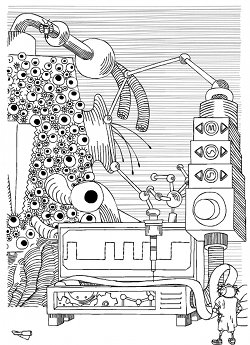Бочка була повна такого затхлого повітря, що аж дух забивало, але Демонові це байдуже; посадив Трурль крихітку верхи над отвором у бочці, заклав угорі великий барабан з паперовою стрічкою, підвів її під діамантове писальце, котре вже аж тремтіло з нетерплячки, – і почалося вистукування – стук‑стук, стук‑стук, як на якомусь телеграфі, але у мільйони разів швидше. Тільки тремтіло й вібрувало маленьке перо з діамантиком на кінчику, а стрічка з інформацією почала повільно спливати на страшенно брудну й засмічену підлогу підвалу.