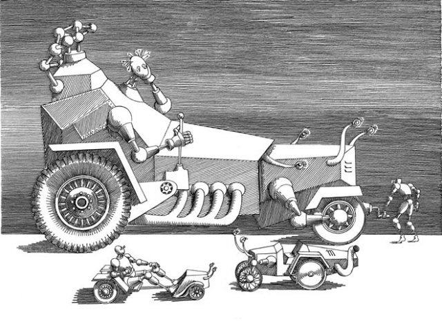 – Нічого, ми дамо тобі відповідний апаратик! – напосідається Трурль. – Тільки подумай, таким способом можна все перетворити на золото, не лише водень, дамо тобі рецепти також для інших атомів; весь Космос можна зробити золотим, варто тільки взятися як слід!