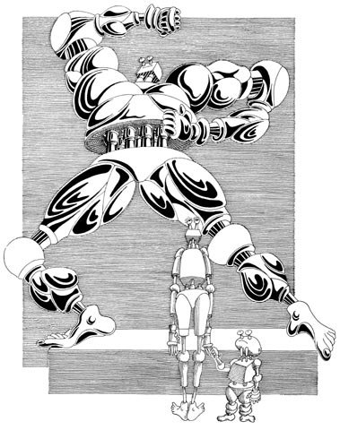 Сміливців різного гатунку з’явилося зразу стільки, що хоч греблю гати. Були серед них і знамениті електрицарі, і спритники‑пройдисвіти, астрозлодії, зореловці; прибув до замку Стрежислав Мегават, славнозвісний фехтувальник‑осцилятор, який володів такими карколомними прийомами, що не було йому рівних у поєдинку; не бракувало добровольців і з далеких країн; наприклад, з’явилися двоє автоматеїв, випробуваних у ста битвах; Протезій, відомий конструктор, котрий інакше, як у двох іскроколбах, – одній чорній, другій срібній, – не ходив; приїхав Арбітрон Космозофович, складений із пракристалів, вишукано стрункий; з’явився також інтелектрик Палібаба, який у вісімдесяти скринях, навантажених на сорок робослів, привіз стару цифрову машину, іржаву від мислення, але з біса винахідливу. Прибули троє мужів з роду селектритів: Діодій, Тріодій і Гептодій, в головах яких був такий бездоганний вакуум, що їхнє мислення було чорне, як ніч без зірок. Прибув Перпетуан, з голови до п’ят у лейденській зброї, з колектором, який геть позеленів у трьохстах битвах; Матрицій Перфорат, що дня не міг прожити, аби не провести на комусь інтегральне зчислення; він привіз із собою непереможного кібера, якого звали Струмос. З’їхались усі, і коли двір був уже повний, прикотилась до його порогів бочка, з якої у вигляді крапель живого срібла виплив Ерг Самозбудник, котрий міг набирати будь‑якої довільної форми.
