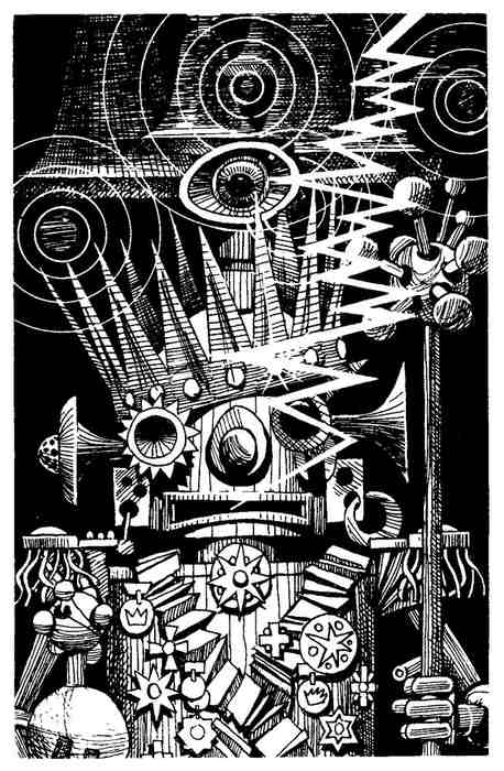 І справді, вона забурчала, загримотіла, засвітилась, складаючи щось у своєму нутрі, і ось уже якась подоба величезного кігтя, електричного, вогненного, вистромилася з її боку; та тут король заволав: