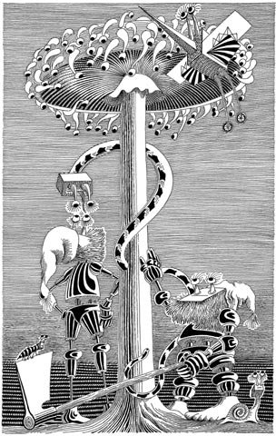 Змішав мудрець кіновар із ртуттю, наповнив цією сумішшю чотири міхури та сховав їх під сукнею юнака. Взяв міхи, надув їх застояним повітрям з старого підземелля й сховав на грудях королевича; налив отруйної, чистої води в скляні трубки, числом шість, дві вклав королевичу під пахви, дві в рукави, дві в очі, а під кінець мовив: