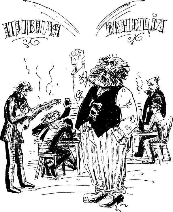 У Рюхалки кроме спиртных напитков имелась и другая приманка: некий Виктор Сергеевич. Это был человек лет тридцати, с длинным красным носом и огромными залысинами, одетый в старинный заплатанный казакин с вытертым бархатным воротником. Виктор Сергеевич каждый день с гитарой под мышкой являлся в пивную ровно в семь часов вечера, скромно усаживался в самый темный угол. Он брал с тарелки кусок ржаного хлеба, мазал горчицей и аппетитно ел маленькими кусочками.