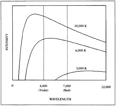 РИСУНОК 3-2 Непрерывные спектры для звёзд с тремя температурами «на поверхности»: 3000 К, 6000 К и 10000 К.