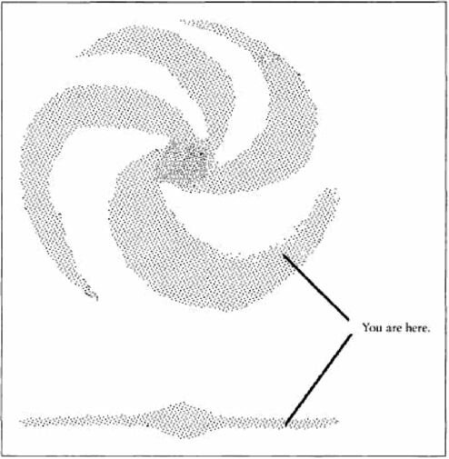 Наша Солнечная система расположена в одном из рукавов спиральной галактики, которую часто называют Млечный путь (рис. 3-3). Наша Галактика будет служить хорошей иллюстрацией того, какие размеры и расстояния присущи галактикам. В ней содержится что-то около 100 миллиардов (1011) звёзд, которые в большинстве своём расположены в диске диаметром около 100 000 световых лет и толщиной в среднем около 1500 световых лет. В нём также есть центральная выпуклость, и всё это вместе окружено приблизительно сферическим облаком горячего газа с разбросанными в нём немногочисленными звёздами, в основном в плотных шаровых скоплениях.