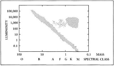 Один из столбцов в таблице 3-1 – «Время пребывания на главной последовательности». Если вы построите график светимости (или абсолютных величин) звёзд в определённой области пространства в зависимости от их температур (или спектральных классов), то получите что-то вроде рисунка 3-4, часто называемого диаграммой Герцшпрунга-Рассела (H-R). (Более подробные версии см. в таких пособиях по астрономии, как работа Смита и Джейкобса.) Главная последовательность – это диагональная полоса, тянущаяся от верхнего левого угла к нижнему правому; многие звёзды проводят на ней большую часть своей жизни.
