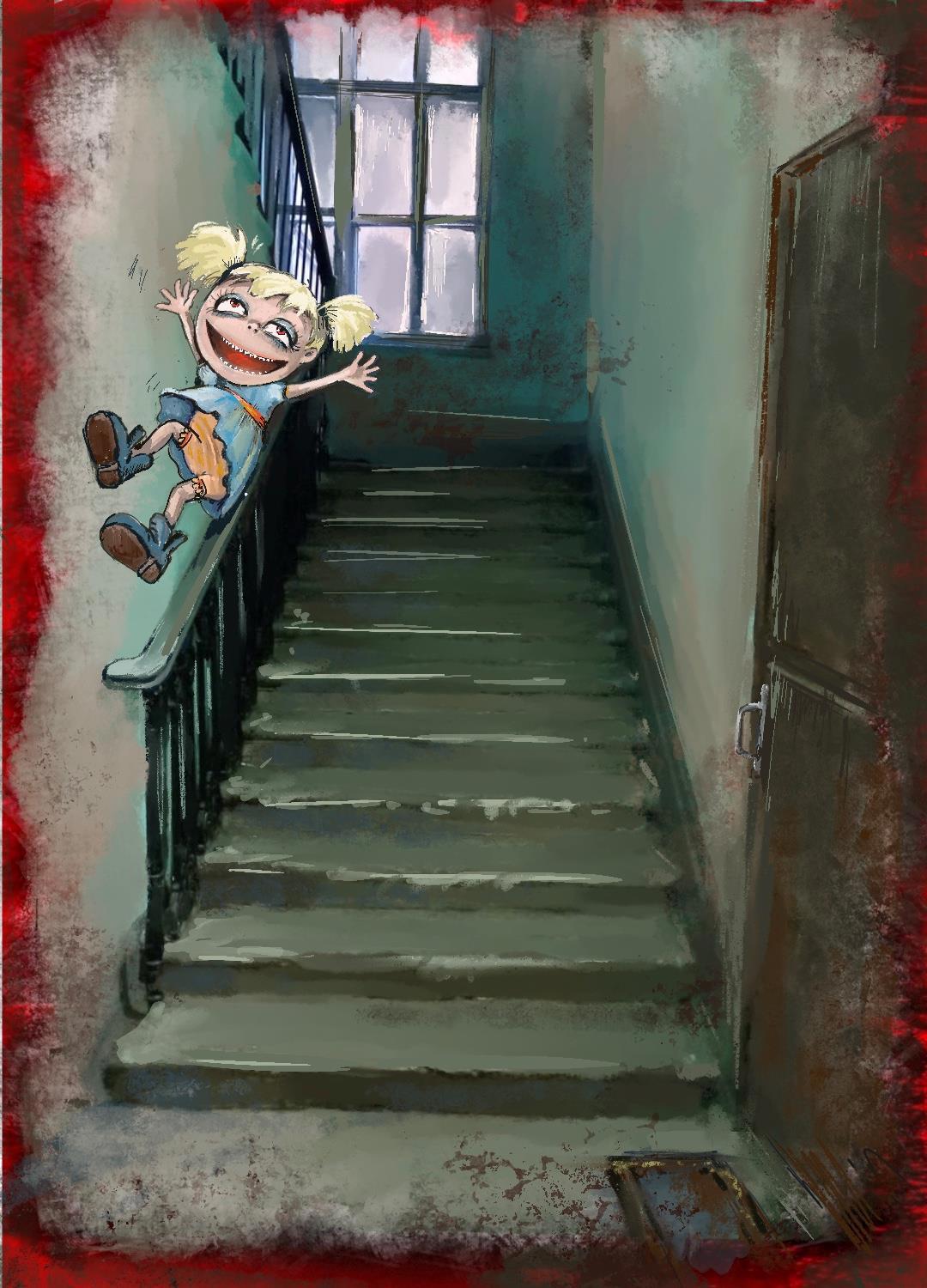 По перилам с визгом и демоническим хохотом скатилась Мара. Улучшила момент пока Блоди затаскивала в квартиру тело участкового и сбежала. Ей страшно хотелось опробовать новый способ спуска по лестнице, когда мама не видит. Ну а то, что часть лестничного перекрытия давно отсутствовала, любимую дочку Адовых совсем не смущало.