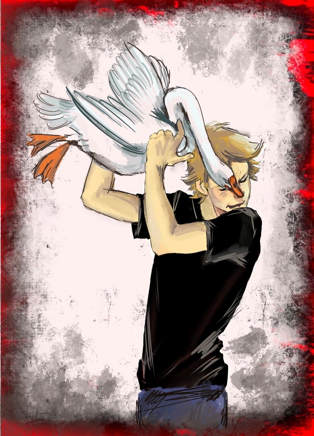 И Даймон вырвал гусиное перо. Пернатому такое обращение пришлось не по вкусу. Гусь, извернувшись, тут же ухватил длинного противника прямо за нос, посчитав за обидчика.