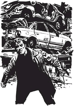 «База металлолома Маккея». Высокий забор из рабицы и колючая проволока сверху. Машины сложены штабелями, будто их наскладировал ураган, превратив пространство между ними в натуральный лабиринт гниющего металла. Здесь же – пресс и подъемник. В задней части – трейлер вместо рабочего офиса.