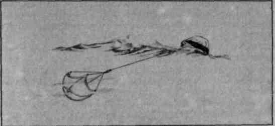 Пульсирующий в воде плавучий якорь напоминает медузу и тащит за собою океан. Он сделан из квадратного куска ткани и присоединяется к плоту с помощью стропок, вертлюга и длинного буксирного конца. Фактически он представляет собой водный парашют, который действует горизонтально. Благодаря ему возрастает устойчивость плота под ударами волн. Однако он же сильно замедляет мое продвижение.