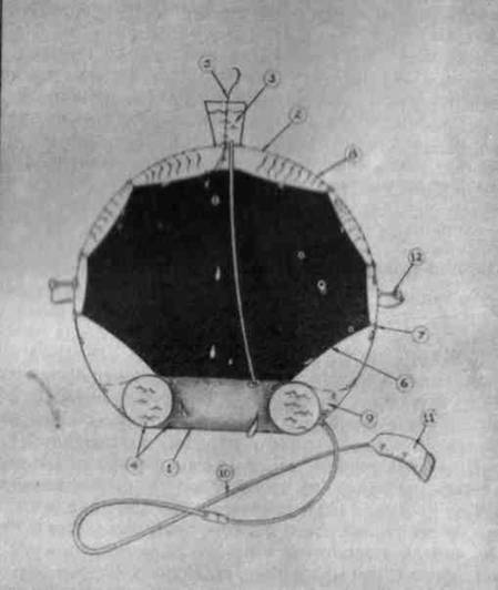 Матерчатое донце (J) пропускает избыточную морскую воду. В мокром состоянии оно становится воздухонепроницаемым и позволяет надуть пластиковый баллон (2). Морская вода наливается в расположенную сверху емкость (3), причем первые полгаллона уходят по перепускной трубке в балластную кольцевую емкость (4). Из приемного стакана (3) соленая вода просачивается внутрь через крохотный клапан. Для его прочистки и регулировки тока соленой воды служит металлическая струна (5). Из клапана вода капает на черный матерчатый вкладыш (в). Он подвешен внутри баллона на петельках (7), которые не допускают его соприкосновения с пластиком, предотвращая тем самым попадание соленой воды со вкладыша на внутреннюю поверхность баллона. После того как черный вкладыш напитывается водой, часть ее испаряется. Эти испарения (волнистые стрелки) собираются изнутри на стенках баллона в виде маленьких капель пресной воды (8). Со стенок они скатываются вниз, в поддон (9), а оттуда по водоотводной трубке (10) перетекают в водосборный мешочек (11). В трубку вставлено устройство, позволяющее периодически снимать мешочек и выливать воду. Для устойчивости он утяжелен кусочком свинца снизу. В средней своей части опреснитель окружен юбкой и стройкой (12). Хотя он и предназначен для эксплуатации на плаву, мне приходится эксплуатировать свой агрегат на борту плота.
