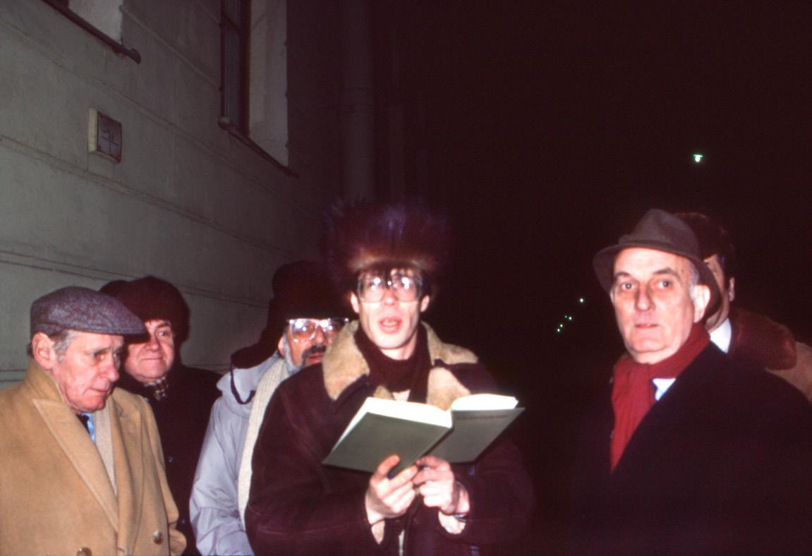 Уильям Гэддис, Даниил Гранин, Аллен Гинзберг и Луи Очинклосс слушают, как русский гид Миша (Misha) зачитывает отрывки из «Братьев Карамазовых» (фото Уильяма Гэсса)