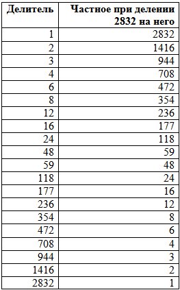 Нашлось лишь двадцать чисел, на которые 2832 делится нацело. Она удалила те, на которые оно нацело не делилось, и получила такую таблицу: