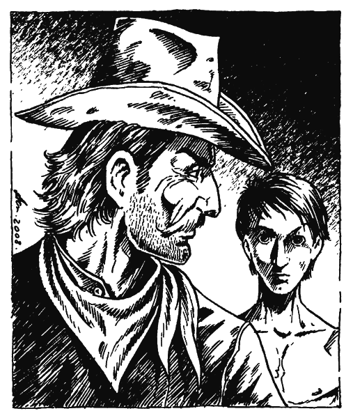 Великими кроками чоловік рішуче перетнув кімнату й підійшов до ліжка (Роланд не встиг навіть розтулити очей, а жінка, що спала на ліжку поряд, ще не почала реагувати на звук). Він був високий, худий, вбраний у линялі джинси й запилену сорочку з синьої тканини. Голову покривав темно-сірий капелюх зі стрічкою зі зміїної шкіри. Низько на стегнах гойдалися дві старезні шкіряні кобури. З них стирчали сандалові руків’я, що їх хлопчик одного дня візьме з собою в ті краї, де навіть не мріяв побувати цей похмурий чоловік з несамовитим поглядом, сповненим синього вогню.