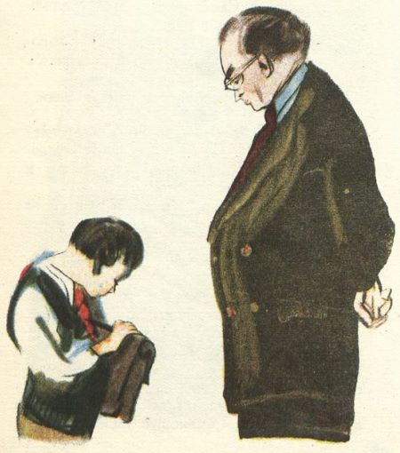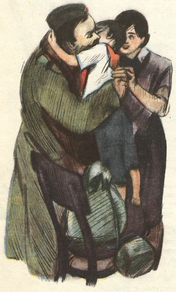 И вот я иду домой и несу папе записку Григория Семёновича, и до того мне тяжело, будто я восемь кирпичей в кармане тащу… Шёл я, шёл, словно сто вёрст прошёл… Притащился домой. А дома так хорошо, как будто сегодня Первое мая. Стол раздвинут, накрыт… Шинель папина в передней висит, – значит, он дома.