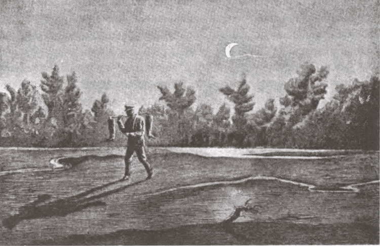 Я и отыскал около лужи чащу, в которой можно было отлично укрыться от бури. Тут я улегся, подложил под голову вместо подушки фуражку и сапоги и заснул крепким долгим сном – в первый раз с 1 мая. Когда я проснулся, было уже темно, но ветер все еще выл в лесу. Было 8 часов вечера. Напившись воды из лужи, я развел большой костер и долго просидел, глядя на пламя.