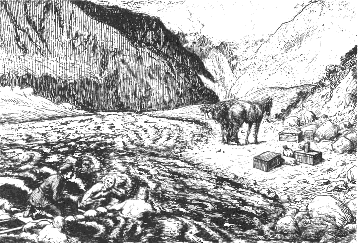 Лошадей опять навьючили, и мы продолжали путь по правому берегу вниз по реке. Скоро, однако, дорогу преградила скала, отвесно спускавшаяся в воду. Таджики вырубили в скале, должно быть в очень уже отдаленное время, тропинку, вроде карниза; край ее сильно выветрел и стал покатым в сторону обрыва и пенящейся реки. Тропинку кое-как уровняли с помощью кольев, ветвей и каменных плит, зато в некоторых местах она стала так узка, что навьюченным лошадям не пройти было – вьюки терлись и задевали за стену скалы, подымавшуюся справа. Мы чуть было не потеряли одну из лошадей, которая зацепилась вьюком на самом узком месте и неминуемо полетела бы вниз, если бы Ислам-бай не успел уцепиться за нее, а остальные в ту же минуту не освободили ее от вьюка. Весь багаж пришлось перенести через опасные места на руках.