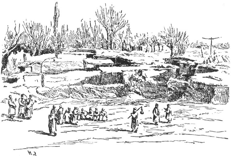О гораздо древнейшей культуре говорят миллионы мелких черепков, остатков глиняных сосудов и обожженного кирпича, разбросанные по всей местности, по обеим сторонам большой дороги. По рассказам туземцев, это следы древнего города Назара. Время от времени находят и древние монеты, кольца, бронзовые украшения и осколки стекла. Я тоже нашел здесь несколько стеклянных осколков светло-голубого и зеленого цвета.
