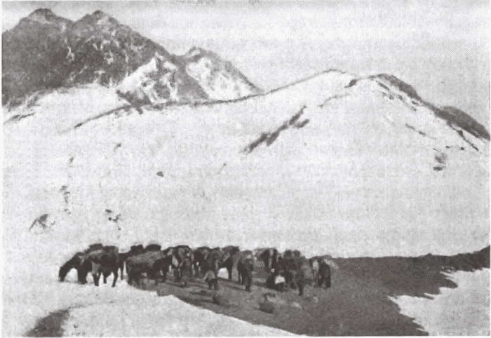 4 марта. Весь день шел снег; всю окрестность заволок густой туман; все было бело кругом; небо и земля сливались. Единственной точкой опоры для глаза была темная линия каравана, голова которого казалась уже серовато-белой и исчезала в тумане. Впереди шли два верблюда. Ехавшие на них проводники отыскивали наиболее твердый слой снега и поэтому ехали, виляя из стороны в сторону. Снег был так глубок, что верблюды часто неожиданно проваливались в него почти по уши, и тогда приходилось выбирать другое направление.