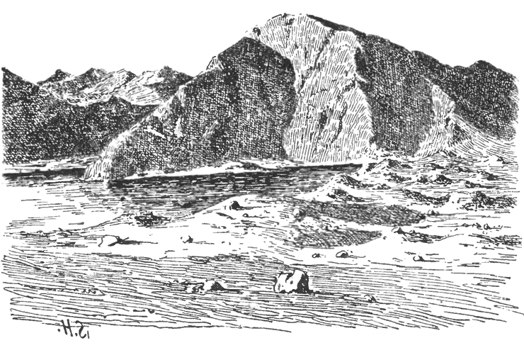 Тропинка пошла по берегу около самого озера, и там, где выветрелые сланцевые скалы отвесно спускались прямо в озеро, нам приходилось ехать по воде. Налево расстилалась отливающая голубовато-зелеными тонами водная равнина, на которой видны были кое-где грязно-желтые полосы, обозначавшие мели из ила, нанесенного сюда ручьями. На западном берегу возвышался мощной стеной хребет Сары-кол с отрогами, теперь едва видными в туманном воздухе.