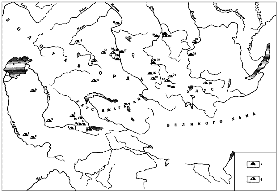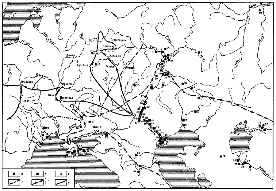 Золотоордынские города и поселения: 1 – Тендыкское, 2 – Сарайчик, 3 – Мавлибердинское, 4 – Байтакское, 5 – Оренбургское, 6 – Абисово, 7 – Болгарское (Болгар), 8 – Кузнечиха (Сувар), 9 – Билярское (Биляр), 10 – Тубулгатау; 11 – Кашан, 12 – Жукотин (Джукетау), 13 – Чебоксарское, 14 – Казань, 15 – Иски-Казань, 16 – Крестово, 17 – Артухинское, 18 – Переволокское, 19 – Костычи, 20 – Канадейское, 21 – Наровчатское (Мохши), 22 – Пугачевское, 23 – Тептяри, 24 – Сухореченское, 25 – Увекское (Укек), 26 – Краснохуторское, 27 – Ахметовское, 28 – Даниловское, 29 – Терновское, 30 – Бережновское, 31 – Шишкин бугор, 32 – Пролейское, 33 – Песковатка, 34 – Ситниково, 35 – Водянское (Бельджамен), 36 – Городище, 37 – Мечетное, 38 – Ахтубинское, 39 – Бахтияровское, 40 – Царевское (Новый Сарай); 41 – Колобовка, 42 – Селитренное (Сарай), 43 – Лапас, 44 – Ак-Сарай, 45 – Красноярское, 46 – Новорычанское, 47 – Тумак-Тюбе, 48 – Самосдельное, 49 – Чертово, 50 – Шареный Бугор (Хаджи-Тархан); 51 – Кан-Тюбе; 52 – Нижний Джулат, 53 – Прикумское (Маджар), 54 – Верхний Джулат, 55 – Азовское (Азак), 56 – Феодосия (Кафа), 57 – Судак, 58 – Старый Крым (Крым), 59 – Херсонес (Херсон), 60 – Чуфут-Кале (Кырк-Ер), 61 – Бахчисарай, 62 – Чемдало, 63 – Старый Орхей (Янги-Шехр), 64 – Костешты, 65 – Белгород-Днестровский (Кермак), 66 – Запорожское, 67 – Конские воды, 68 – Искер, 69 – Ишимское, 70 – Сыгнак, 71 – Дженд, 72 – Янгикент, 73 – Сауран, 74 – Ургенч (Хорезм), 75 – Шемаха-кала, 76 – Шахерлик, 77 – Ходжеили, 78 – Джанбас-кала, 79 – Белеули. Составил Г.А. Федоров-Давыдов.