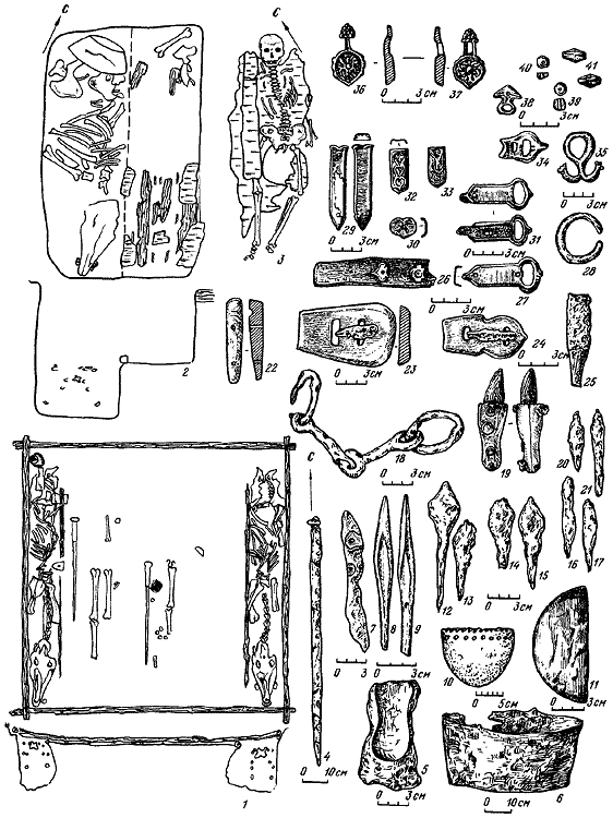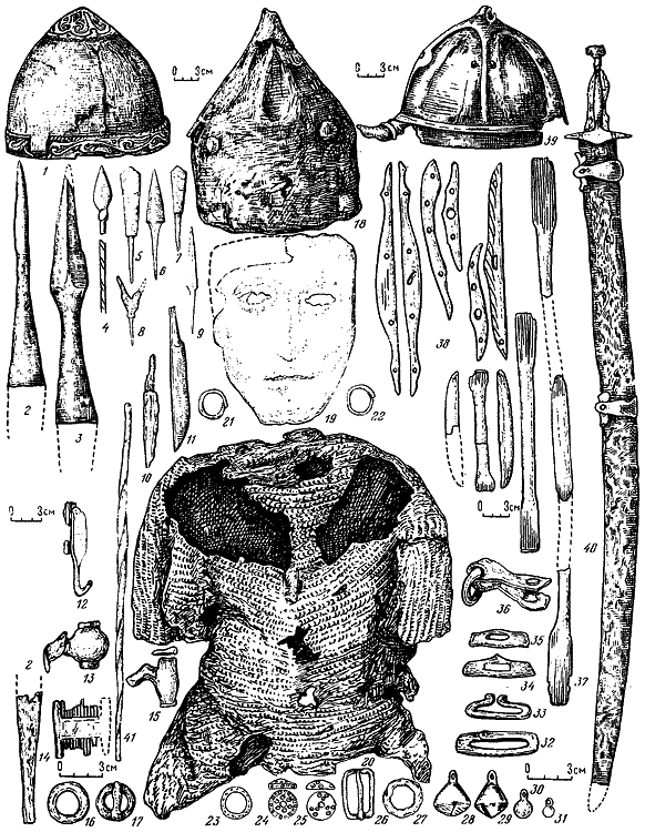 4, 5–7, 12–18, 20, 21, 25, 36, 37 – железо; 8, 9, 22 – кость; 10 – глина; 11, 26 – бронза, кожа; 19 – бронза, железо, дерево; 23, 24 – кость, железо; 27–35, 38 – бронза; 39–41 – стекло белое, красное, коричневое.