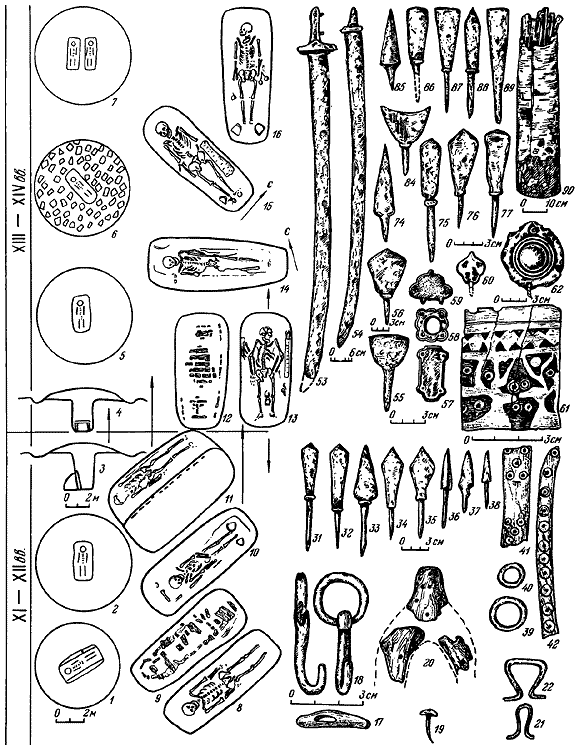 Рис. 70. Погребены XI–XII и XIII–XIV вв.