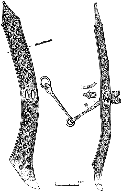17 – застежка от пут; 18 – крючок; 19 – гвоздь; 20 – основа седла; 21, 22 – скобы; 23, 43, 44, 64, 79, 91 – стремена; 24, 25, 63, 94 – удила; 26 – брошь; 27, 96–98 – серьги; 28, 29 – ножницы; 30 – бубенчик; 31–38, 55, 56, 74–77, 84–89 – наконечники стрел; 41, 42 – седельные канты; 45–48, 66–69 – ножи; 49–51, 70 – кресала; 52 – пряслице; 53, 54 – сабли; 57–59, 95 – нашивные бляшки женской одежды; 60 – накладка несохранившегося предмета; 61 – накладка колчана; 62 – налобник уздечки; 65 – седельное кольцо для приторачивания; 71 – «бокка»; 72 – клевец, молоток; 73 – сосуд; 78 – скобель; 80, 93 – подпружные пряжки; 81 – декоративная бляха от пояса: 82 – чаша; 83 – подвеска; 90 – колчан; 92 – пряжка от пояса пли колчана; 99 – колечко; 100 – кольца с кружками от петли зеркала; 101 – зеркало; 93 – язычок реконструирован. Составил В.А. Могильников.