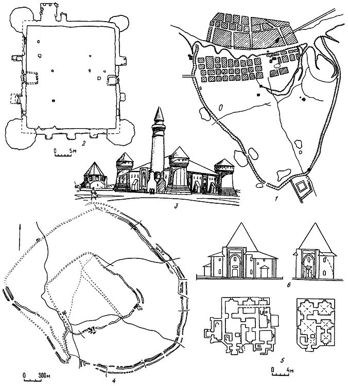 1 – план Болгара; 2 – план мечети («Четырехугольника»); 3 – реконструкция мечети; 4 – план Биляра; 5 – план караван-сарая; 6 – реконструкция караван-сарая. Составила С.А. Плетнева.