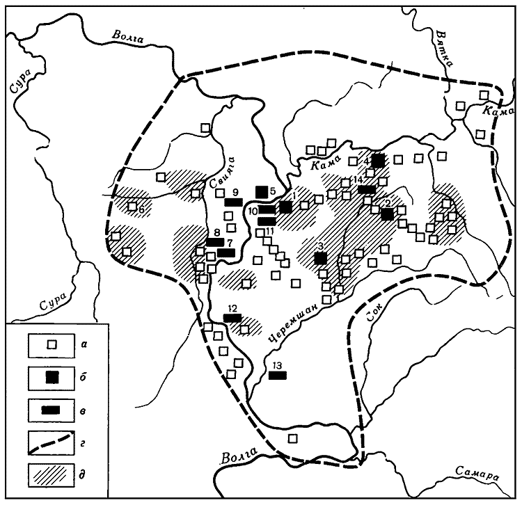 1 – Болгар; 2 – Биляр; 3 – Сувар; 4 – Джукетау; 5 – Ошель (Ашлы); 6 – Тигашевское городище; 7 – I Больше-Тарханский; 8 – II Больше-Тарханский; 9 – Тетюшский; 10 – Танкеевский; 11 – Кокрятский; 12 – Кайбельский; 13 – Хрящевский; 14 – Больше-Тиганский. Составила С.А. Плетнева.