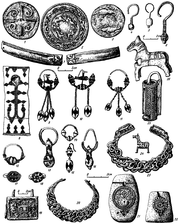 1–3 – зеркала; 4–6 – серьги золотоордынского времени; 7 – браслет «болгарского», типа; 8 – серебряная пластинка с зернью и сканью; 9-16 – височные подвески или серьги домонгольского времени; 17, 18 – перстни домонгольского времени; 20, 23 – плетеные браслеты; 19 – капторга – нагрудная подвеска-коробочка; 21, 22 – литейные формы; 24–26 – замки. Составила С.А. Плетнева.