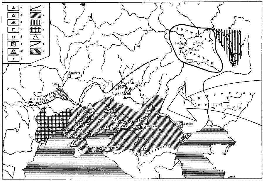 а – половецкие кочевья; б – поселения бродников; в – могильник «диких половцев» на Днестре; г – русские города; д – болгарские города; е – предполагаемое местоположение половецкого города Саксина; ж – предполагаемое крупное поселение половцев (с находками обломков русской керамики на нем); з – памятники XII–XIV вв. в Башкирии; и, – граница лесостепи и леса; к – земли, запятые половцами; л – земли, занятые кочевниками в Башкирии; м – земли, запятые кочевниками (остатками печенего-торческих орд); н – номера союзов половецких орд, выделенные благодаря картографированию каменных изваяний; о – граница Волжской Болгарии; п – земли Черных Клобуков и других кочевых вассалов Руси. Составила С.А. Плетнева.