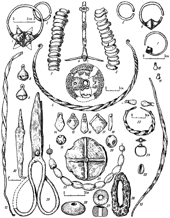 Рис. 84. Комплекс, характерный для женских погребений половецкого времени (конца XI–XII в.) (1-30). Составила С.А. Плетнева.