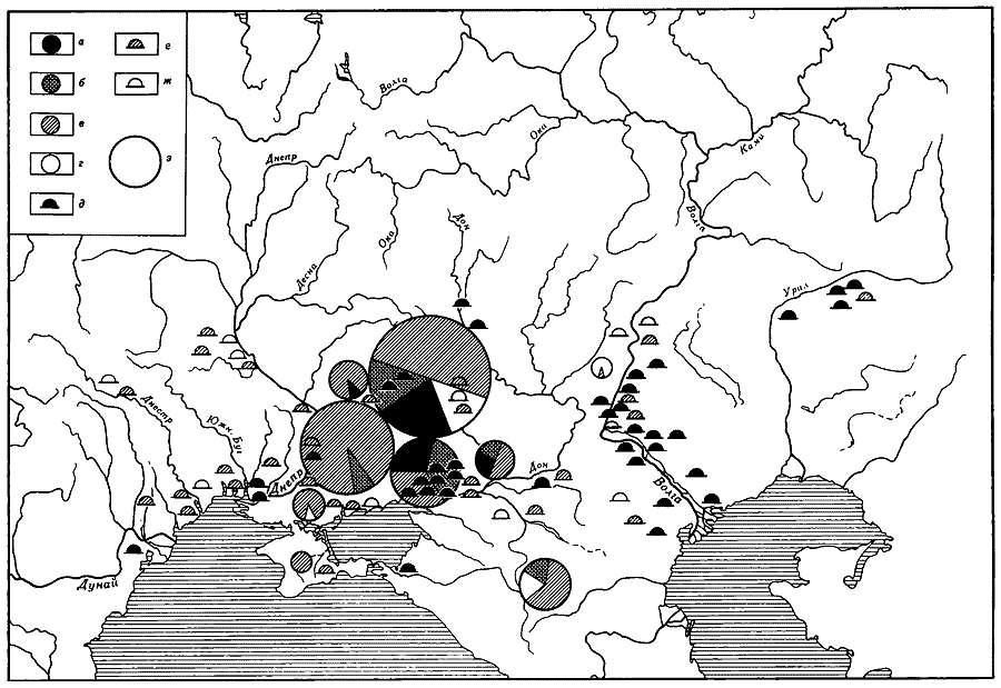 а – изваяния XI в.; б – изваяния конца XI в.; в – изваяния XII в.; г – изваяния XIII в.; д – курганы XI в.; е – курганы XII в.; ж – курганы XIII в.; з – круг данной величины обозначает 10 % от всех обнаруженных в степях изваяний. Составила С.А. Плетнева.