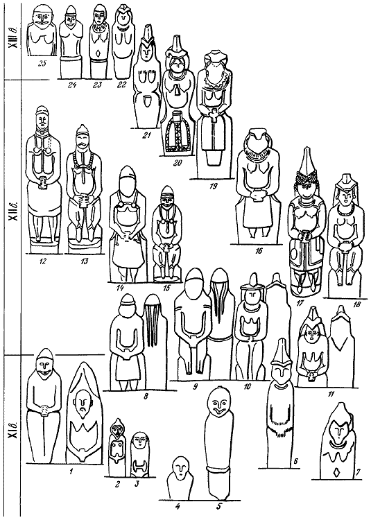 Рис. 87. Эволюционно-хронологическая таблица каменных мужских и женских изваяний половцев (1-25). Составила С.А. Плетнева.
